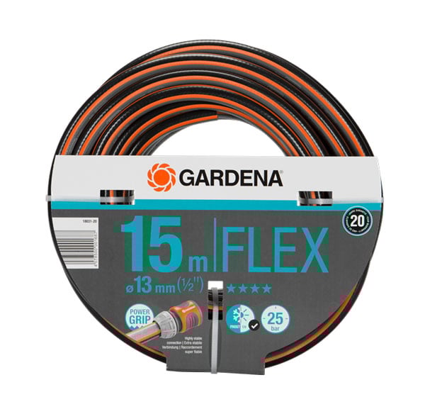 Λάστιχο με Power Grip, 15 m. Το Λάστιχο Comfort Flex της GARDENA, με την τεχνολογία Power Grip, εγγυάται την τέλεια σύνδεση μεταξύ λάστιχου και ταχυσυνδέσμου. Χάρη στη νέα τεχνολογία λάστιχο και ταχυσύνδεσμος αλληλοσυνδέονται όπως οι οδοντωτοί τροχοί. Το Power Grip καθιστά δυνατό αυτό που πάντα επιθυμούσαν οι ιδιοκτήτες κήπων, την αξιόπιστη σύνδεση με τέλεια δύναμη συγκράτησης. Ένα θετικό στοιχείο αυτής της τεχνολογίας είναι ότι το λάστιχο διπλώνεται πιο εύκολα και σύρεται καλά. Χάρη στην ειδική πλέξη με δύο σπείρες που απλώνονται σε αντίθετες κατευθύνσεις, το εύκαμπτο λάστιχο είναι ανθεκτικό στην πίεση και διατηρεί το σχήμα του, ενώ ταυτόχρονα είναι και ευέλικτο και εύκολο στο χειρισμό. Δεν μπλέκεται σε κόμπους και δεν τσακίζει. Αυτές είναι οι καλύτερες προϋποθέσεις για μια άνετη και ευέλικτη χρήση στον κήπο σας. Εάν απαιτείται, μπορεί να συμπληρωθεί με τα εξαρτήματα και τις συσκευές σύνδεσης του Original GARDENA System. Είναι φυσικά ανθεκτικό στην υπεριώδη ακτινοβολία. Τα χοντρά τοιχώματα το καθιστούν ιδιαίτερα στιβαρό και ανθεκτικό. Πίεση: 25 bar.